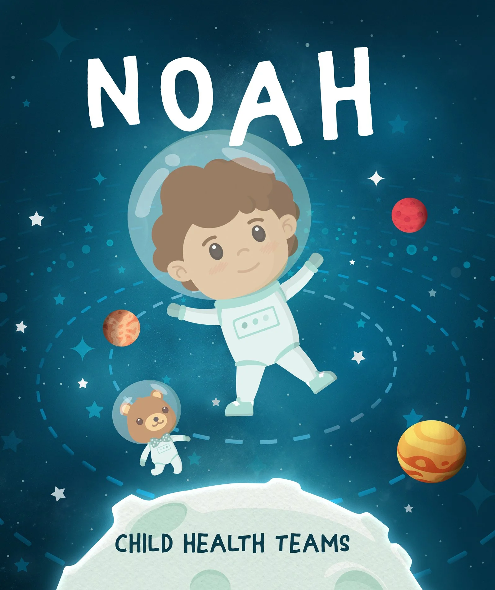 Noah and Mr. Bear, floating through the stars. Promotional Poster for Access Health & Community. Turned into a children's 3d pop-up book cover.